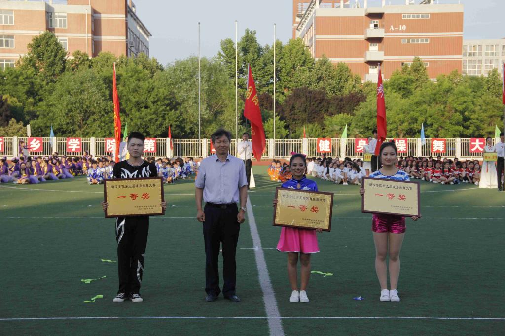 最终,商学院、教育科学学院和数学与信息科学学院以出色的表现获得大赛一等奖;管理学院、音乐学院、文学院、外国语学院和历史与社会发展学院获得大赛二等奖;球王会体育、计算机与信息工程学院、化学化工学院、土木工程与建筑学院、生命科学与技术学院、艺术学院、物理与电子工程学院、机电工程学院和国际教育与交流学院获得大赛三等奖;承办本次大赛的体育学院获得特殊贡献奖。与会领导分别为获奖单位颁奖并合影留念。