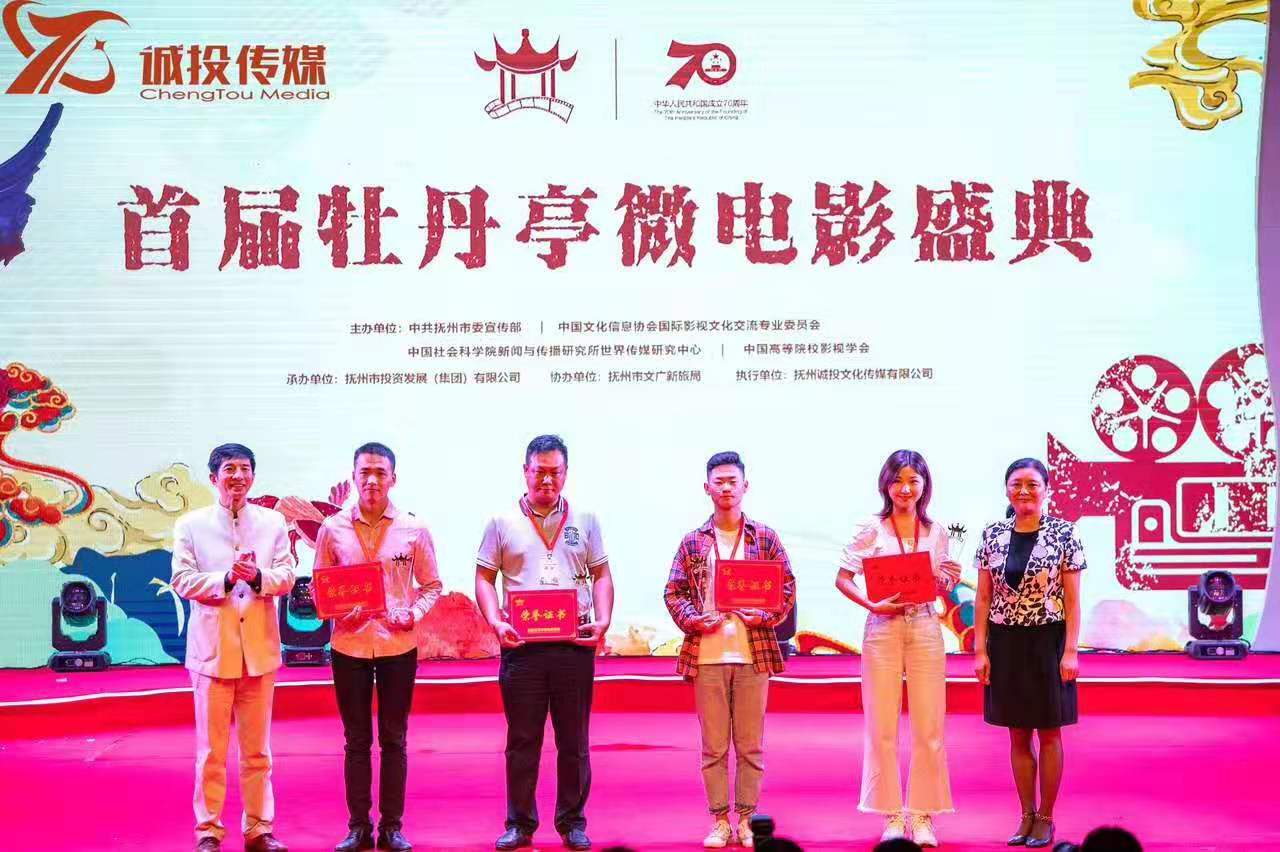 球王会体育于2019年10月12日参加在江西抚州举办的首届牡丹亭微电影盛典暨第五届万峰林微电影盛典颁奖典礼。公司在激烈的角逐中,斩获四个奖牌,《Havana》 最佳制作一等奖,《零叁柒叁》 短片类二等奖,《影像里的道口古会》 (先导片)短片类二等奖,《妈妈的手》 短片类三等奖。员工代表上台领奖并与冷冶夫老师合影留念。本届微电影节由中国文化信息协会、中国社会科学院、中国高等教育影视学会会、中共抚州市委宣传部主办,英国环保国际电影节、半岛国际纪录片节、中东国际电影节、美国丝绸银幕电影节协办。本次活动以“我与祖国共成长”为主题,来自全国各电视台、大专院校、影视机构、视频网站和独立制作人的3700多部作品参加竞逐,其中包括纪录片、剧情片、微电影、微视频、手机视频和VR等新技术,经活动组委会评选,共145部作品分获各类奖项。